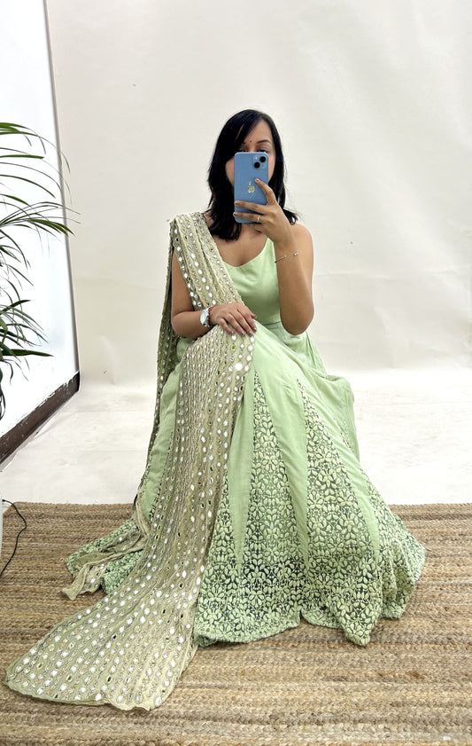 Green Embroidered Anarkali with Mirrorwork Dupatta